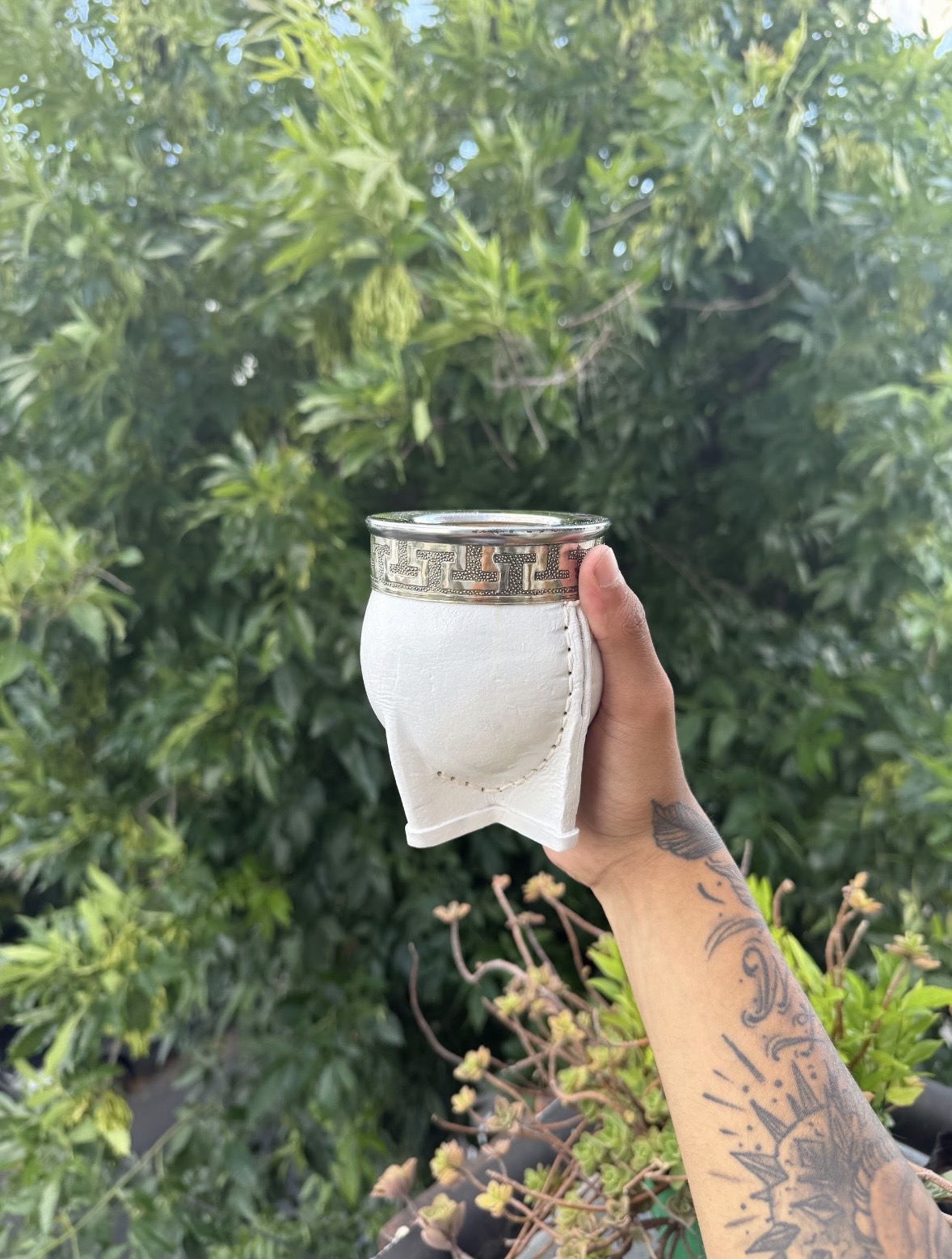 Mate imperial Blanco interior de calabaza seleccionada, forrado de cuero vacuno de alta calidad, virola de acero, fleje de alpaca y base de alpaca reforzada.